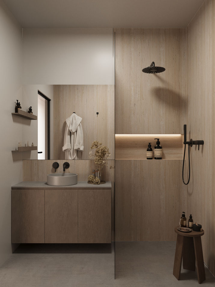 In the private rooms, the palette softens further. The bedrooms pair pale timber headboards and mid-toned parquet with crisp linen and wool. A focus on volume and proportion, rather than decorative detail, lends an air of serenity – simple pendant lights, concealed storage and neutral-toned walls allow the materials to speak. In the en-suite, textured natural stone tiles and oak joinery continue the narrative of honest, tactile surfaces, creating a cohesive home that reflects both the professionalism and the warmth of its occupants.